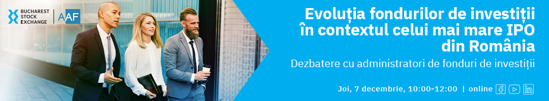 Bursa de Valori Bucuresti (BVB) si Asociatia Administratorilor de Fonduri (AAF) anunta deschiderea oficiala a sedintei de tranzactionare din 7 decembrie, alaturi de reprezentanti ai administratorilor de fonduri de actiuni cu expunere si pe piata de capital locala care au obtinut top 5 cele mai performante randamente calculate pe ultimele 12 luni pana la finalul celui de-al treilea trimestru din acest an. Evenimentul face parte din seria de dezbateri organizate de BVB si AAF.