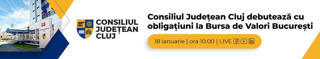 Bursa de Valori Bucuresti va invita sa urmariti joi, 18 ianuarie, de la ora 10:00, deschiderea oficiala a sedintei de tranzactionare cu ocazia debutului la bursa a obligatiunilor Consiliului Judetean Cluj. Emisiunea de obligatiuni s-a desfasurat in cadrul unui plasament privat, incheiat în luna decembrie a anului trecut. Suma atrasa de la investitori a fost de 76 milioane de euro.